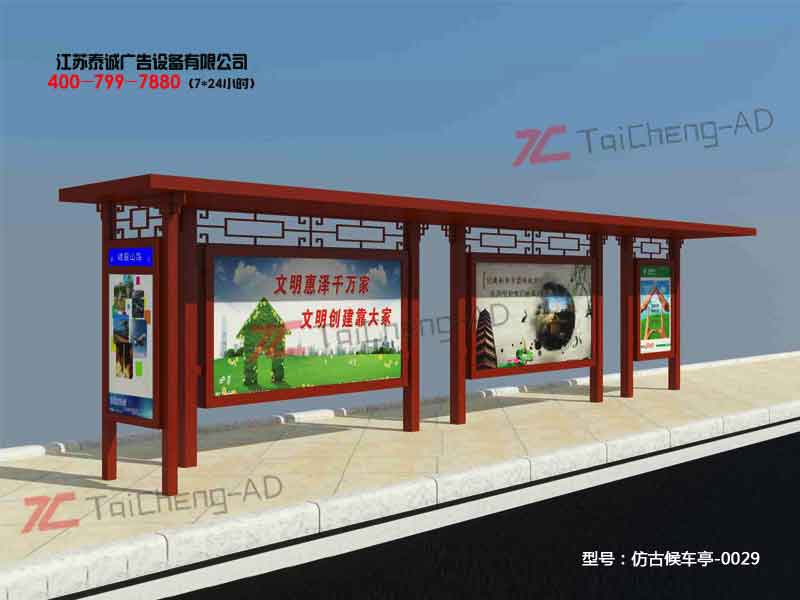 歡迎光臨江蘇泰誠設備科技有限公司 公司專業(yè)生產定做公交站臺、候車亭,宣傳欄,標識標牌等系列產品!